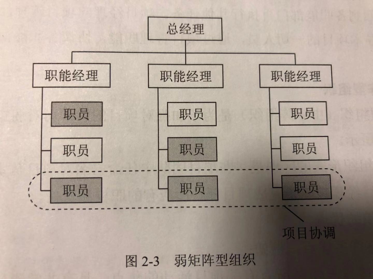 弱矩阵型组织保留了职能型组织的大部分特征,其项目经理的角色更像是协调员或者联络员,而非真正的项目经理,如上图。